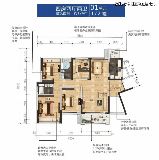 户型特色:如 97㎡的 3 室 2 厅户型,客厅连接纯向南舒适阳台,配备生活阳台,增加使用空间,南向卧室配备全玻璃飘窗,阳光轻松入室,南北通透,户型方正,还有多功能房设计;124㎡的 4 室 2 厅户型,自带 4.2m 大阳台,南北通透,采光充足,开阔视野,享有入户花园,独立卫浴,隐私度高,户型方正,实用性高,多功能房可享三代同乐。