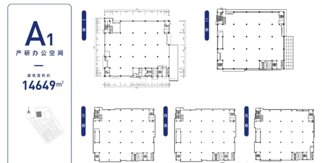产研办公空间:A1 建筑面积约 14,649.51㎡,A2 建筑面积约 19,562.49㎡,总高 5 层。