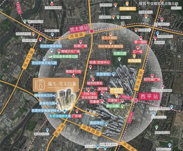 南城【莞太印象】,位于东莞中学南城学校旁,约800米万象府,约1公里中心公园。周边交通网络发达,东莞大道、环城路、环莞快速等多条主干道环绕,为出行提供了极大的便利。同时,项目还邻近东莞R1线(建设中)和东莞R2线,可轻松抵达西平站,实现与莞惠城轨的无缝换乘。