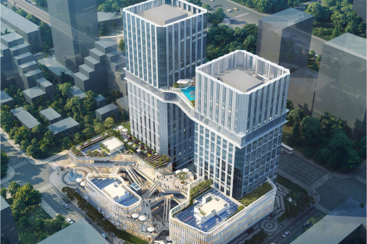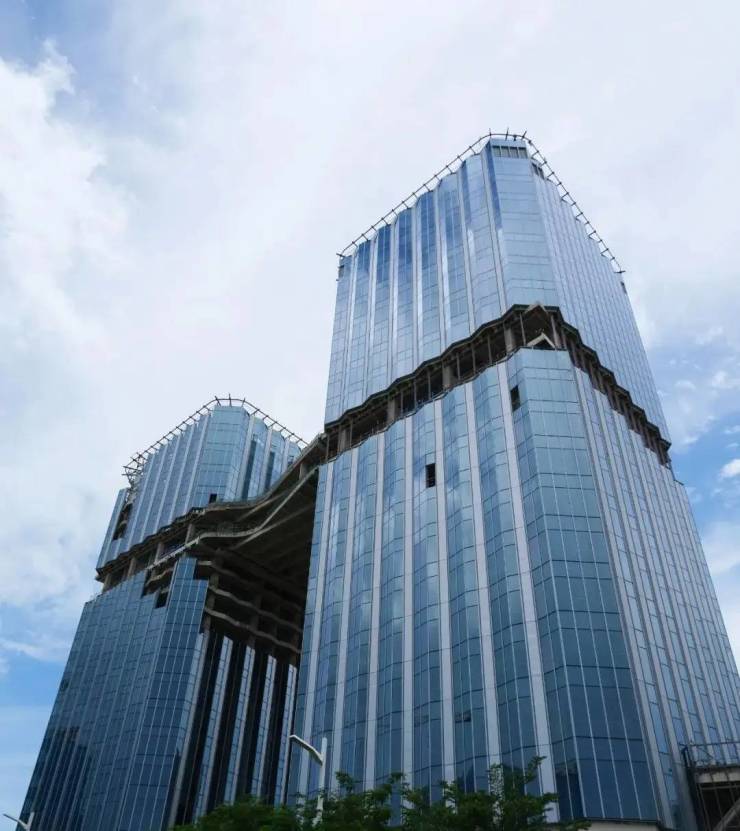 双塔门户造型,60 米高空连廊,江东地标。