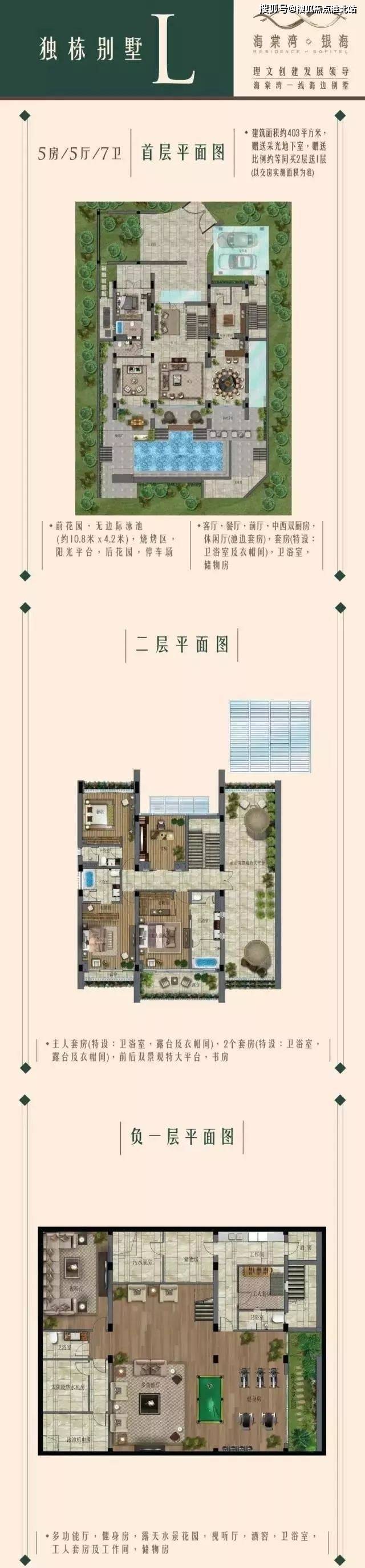 别墅全部独门独院,并配有前后私家花园、车库及游泳池,配套来自法国索菲特酒店的设施和服务,将壮阔的海岸景观引入富丽堂皇的室内空间中来,尽显豪门身段。