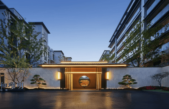 江屿无界的景观共享庭院,会客厅顶部采用香槟金色铝板、金属帘搭配深灰色石英砖,景墙用弧面形成园区照壁,做出月洞门的意象。