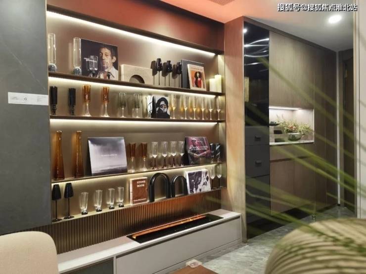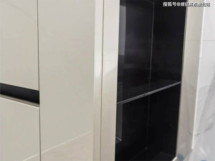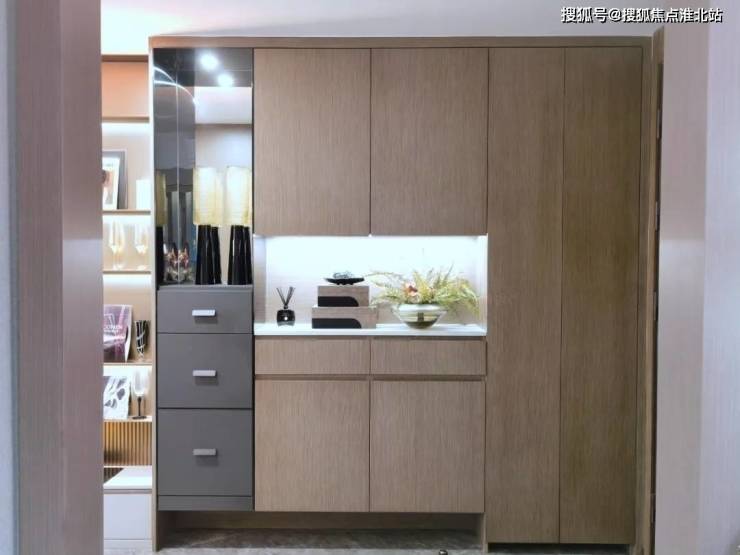 通顶玄关柜中空与底部留空设计;整体布局不仅充分挖掘顶部储物空间,同时中空开放格方便放置摆件小物品,提升仪式感;底部换/拖鞋回位,拿取一气呵成动线流畅;左侧打造金属不锈钢开放格,与肤感铁刀灰吸塑板相呼应提升玄关柜整体质感