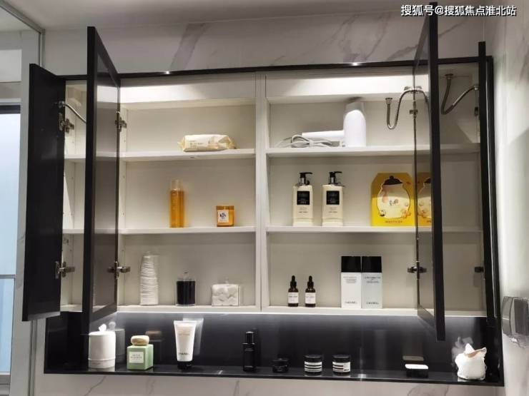 镜柜+悬空地柜+侧边收纳柜,超强收纳力让洗漱空间变得干净有序;镜柜不锈钢金属套框与地柜侧边不锈钢金属收纳壁龛,增加储物功能同时也提升高级感,侧边柜两层设计物品容纳量翻倍,暗藏小巧思体验感拉满;悬空地柜让浴室空间视觉上更为轻盈、简约