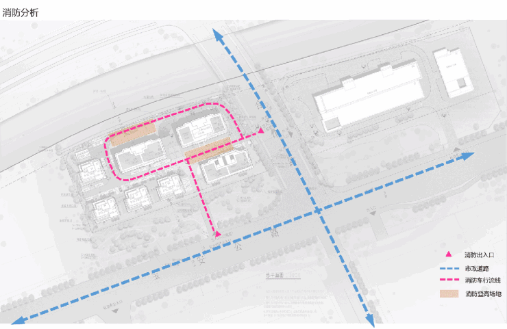 流线分析:基地设内部道路环通,地下车库出入口靠近基地出入口,流线短捷,车流进出顺畅。地面以上车行道路主要考虑消防需要,平时车辆进入后均就近进入地下车库,真正意义上做到人车分流。