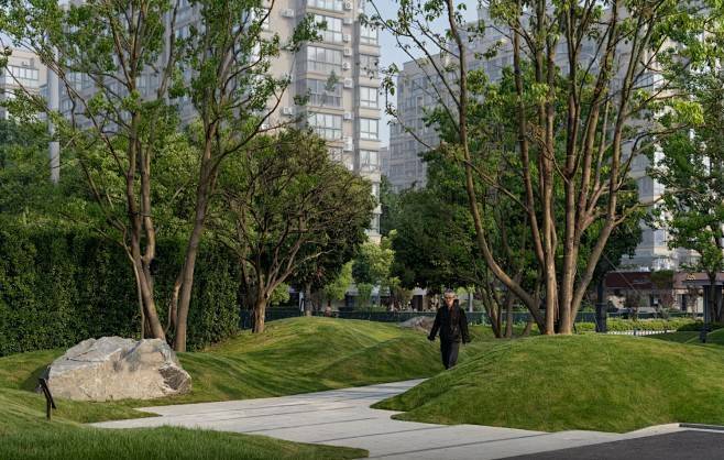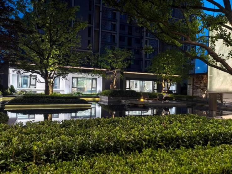 项目以 “一园三堂,意境东方” 为理念,打造五重归家礼序。从入口的景墙水院,到中央景观轴的叠石飞瀑,再到楼栋间的私密花园,每一步都浸润东方美学的诗意。园林面积达 9219㎡,借鉴倪瓒画作《江亭山色图》,以蟒水纹光影连廊串联三重水景,下沉式 “兰芷轩” 仿孔明灯造型,营造出诗意的居住环境。