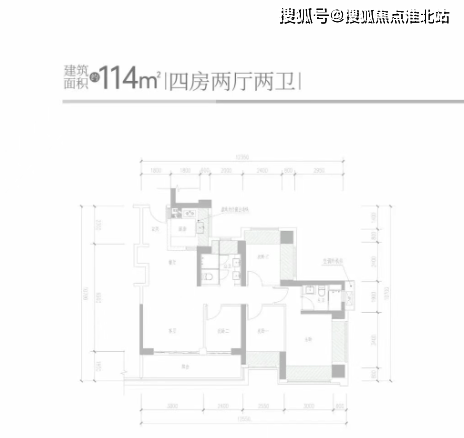 114㎡四房两厅两卫:经典竖厅格局,客厅 3.8 米开间,进门独立玄关,LDKB 一体化设计,4 个卧室宽度分别为 3.8 米、3.2 米、2.55 米、2.44 米,U 型厨房,公卫三段式分离设计,得房率约 95%,客厅连接次卧出 6.2 米的大阳台,朝东南向。