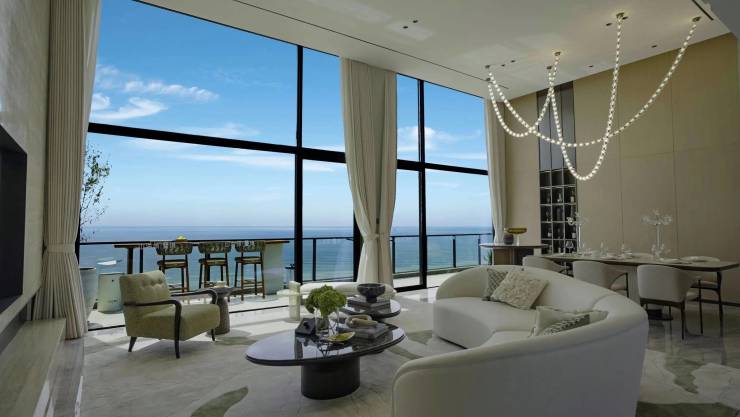 社区规划:热带高端度假园林、无边际泳池、健身中心、业主餐厅、私属滨海步道、共享会议室;共享富力湾 200 亩国际游艇码头(108 个泊位)、海上运动基地;现代简约滨海院墅风,垂直院落,挑空 6 米多功能厅,大面积落地窗 + 露台;