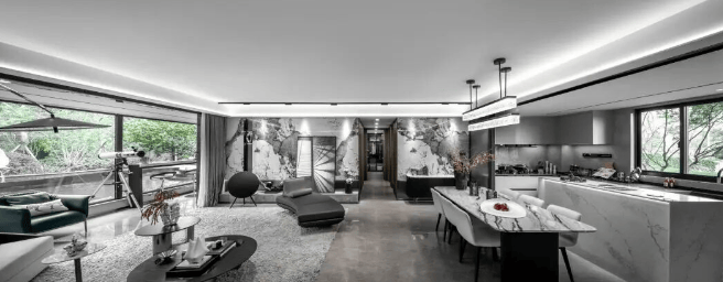 小区打造了星空酒店式入户门头,高约 6.5 米,入户砖石精选爱马仕灰石材。园林以水为题,融合法式园林和龙湖五重园林景观,设有约 4.8 米的深灰色背景墙、鎏金会客厅、下沉漂浮水中卡座等景观设施,以及 “坐忘林” 等休闲空间,整体环境优美,居住舒适度高。