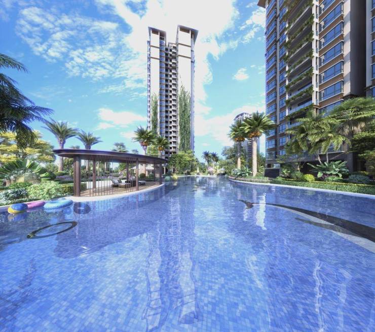 小区配套:以组团式布局构建园林盛景,楼间距宽阔。内部有幼儿园、连廊商业、游泳池、东方会客厅、康体步道、阳光草坪、童趣乐园等全龄空间。其中,C 区规划约 700㎡休闲泳池,分为儿童戏水池和成人泳池,配有照明灯具、户外淋浴及绿墙围挡。