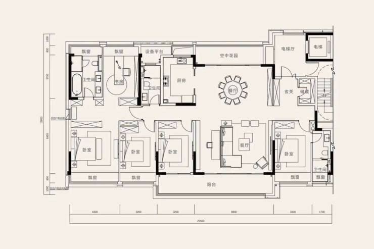 五房两厅三卫设计,项目的终极改善户型,在建面约251㎡户型上继续升级改造,南向面宽是惊人的约22.5米。
