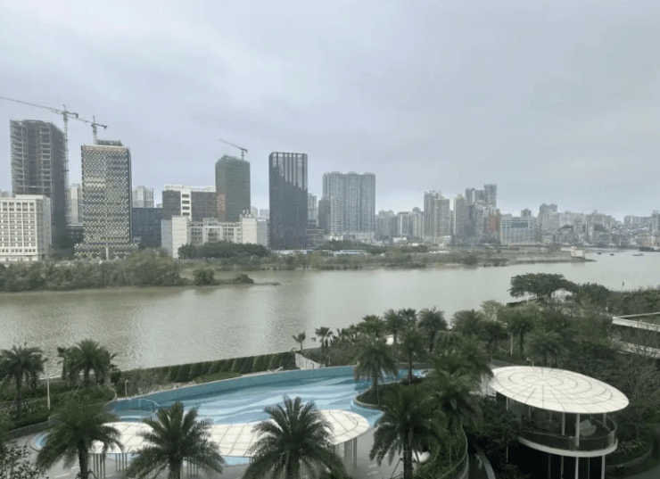 前瞰濠江,对望澳门,部分高层可直视澳门塔、葡京酒店及港珠澳大桥。