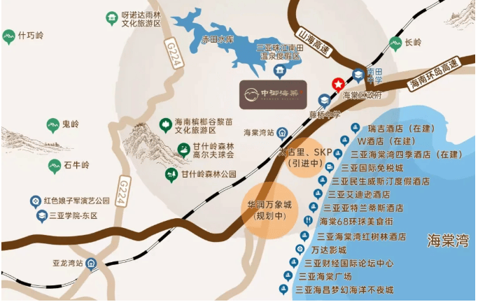 位于海棠湾南田片区,坐拥海棠湾“国家海岸”核心资源,周边汇聚32家超五星级酒店、亚洲最大单体免税店、三甲医院、国际学校等千亿级配套。