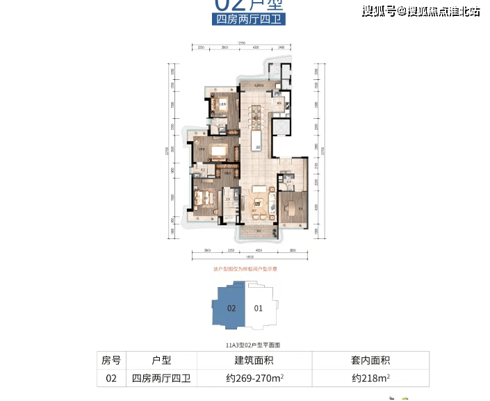 洋房:有 20#11A3 型洋房,建筑面积约 270㎡。此外还有 J 型 03 户型,建面 193.19-195.41㎡,为 4 室 2 厅 3 卫 1 厨设计,有 2 个阳台、2 个飘窗,南北通透,明厨明卫。