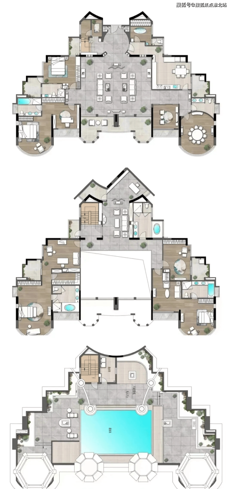 再细看,约458平、467平、564平顶复户型图参考如下,为双层结构,且赠送多一层露天泳池花园,相当于有3层使用空间。