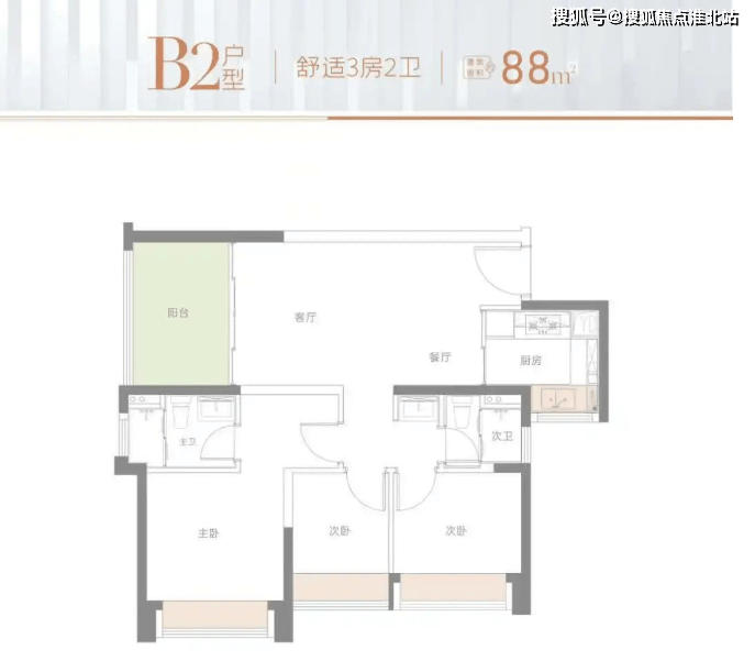 88㎡三房两厅两卫:三个卧室均朝南向,公卫三段式分离,居住体验更佳。