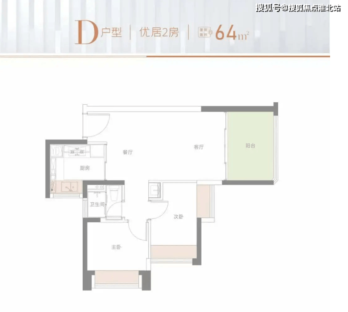 64㎡两房两厅一卫:竖厅格局,LDKB 一体化,双卧室朝南向,次卧双飘窗设计,得房率较高。