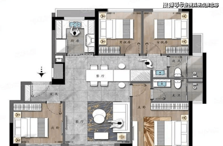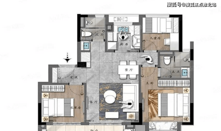 118平米:四房两厅两卫,三开间朝南,包心布局,主要问题在于餐厅位置,这也是四叶草布局主要的劣势,对比目前三江口几个纯商楼盘的端头户型,该户型优势并不大。