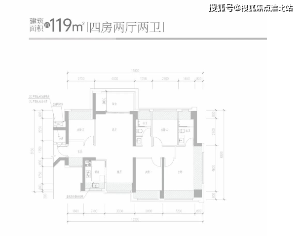 120-139㎡四房两厅两卫:横厅南北通透格局,客餐厅 6.4-6.35 米宽,进门独立玄关,U 型厨房,公卫三段式分离设计,带大阳台进深 1.7 米,长 6.2-8.8 米,主朝西北或东北向,可看科学公园景观。以 119-120㎡户型为例,4 个卧室分别做到了 3.3 米、2.9 米、2.7 米、2.5 米的宽度。