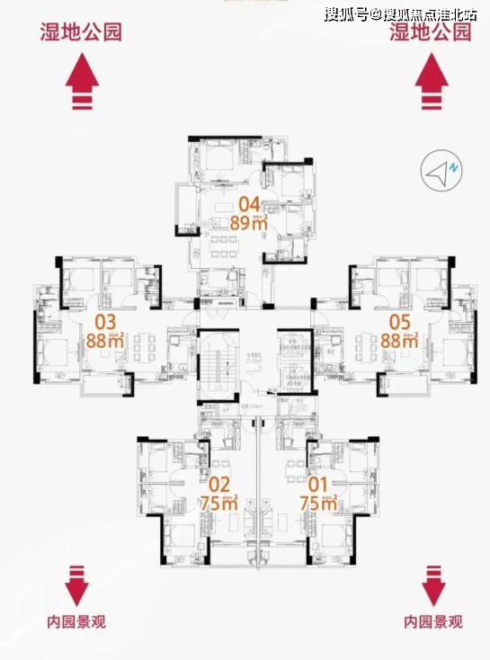 户型设计:有建面约 75㎡的三房两厅一卫、89㎡的三房两厅两卫(横厅、竖厅)以及 99㎡的四房两厅两卫等户型,户型方正,功能齐全。