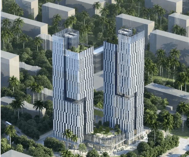 建筑:核心筒钢结构,约 100 米高;1–2 层商业(6 米层高),3–17 层办公;3 梯 6–9 户,电梯配比高