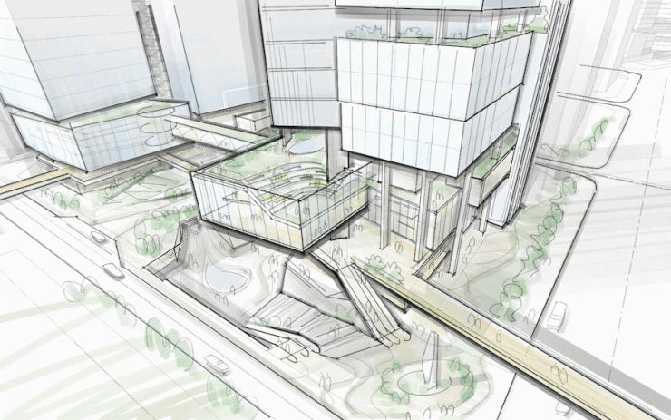 作为大湾区城市地标综合体,东莞香港中心融合豪华住宅、办公总部、顶级商业、高端公寓等功能于一体。绿轴骑楼商业街的交通以步行系统为核心,通过下沉广场、骑楼街道、商场中庭、无风雨空中连桥和各层遮阳系统,打造24小时开放的立体式步行社区,高效串联地铁TOD站点、莞邑公园、绿轴广场、住宅小区、商办建筑以及周边地块,为市民营造15分钟步行范围的舒适生活圈。