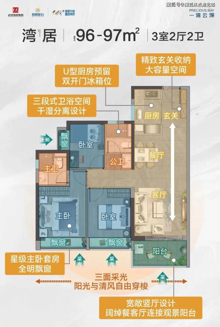 如建面约96-97㎡三房,宽敞竖厅设计,客厅+主次卧三开间朝南,享有约9.5米朝南面、全屋飘窗,极致采光通透体验,保证家庭空间日照充足;U型厨房,预留双门冰箱位,厨房操作空间充足,流线通畅;卫浴则实现三分离,可容下多人同时使用,厨房与卫浴的贴心设计,更提升着居住舒适度。