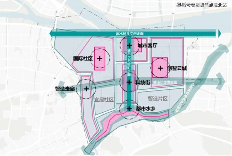 以科技街为中点,打造城市客厅、创智云城、都市水乡、国际社区、智造走廊等区域,发展城市TOP智汇走廊和滨水码头文创走廊。