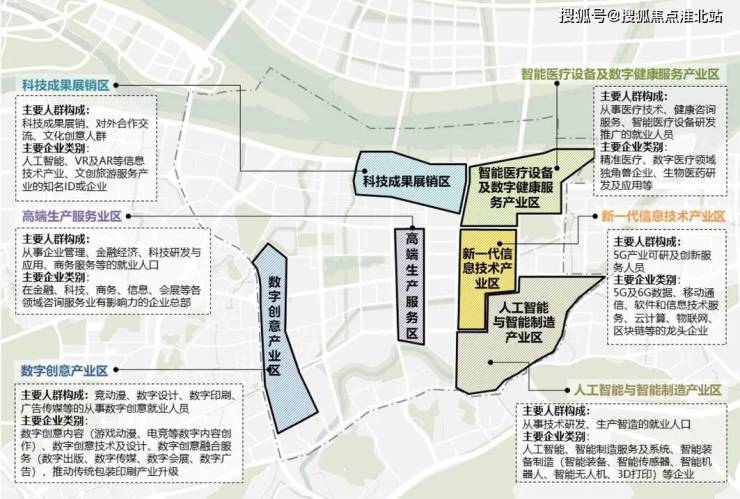 分别为科技成果展销区、高端生产服务业区、数字创意产业区、新一代信息技术产业园、智能医疗设备及数字健康服务产业区、人工智能与智能制造产业区。