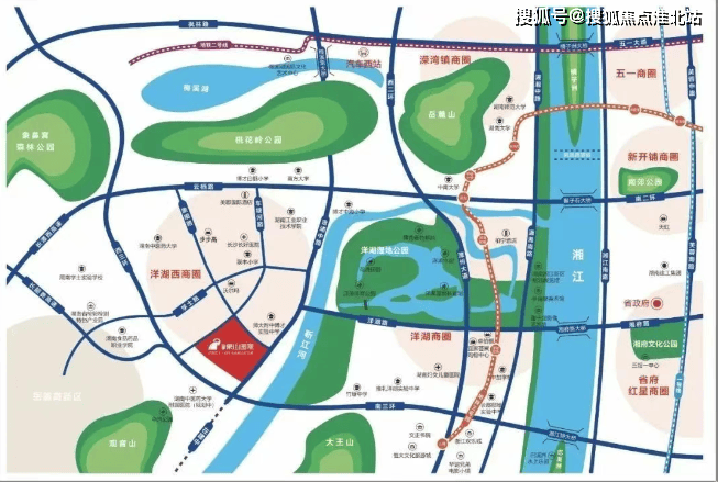 生态配套:周边有靳江河风光带(规划中),以及桃花岭、岳麓山等自然景观,还有自建的约 3 万方中央公园、洋湖国家湿地公园、象鼻窝森林公园。