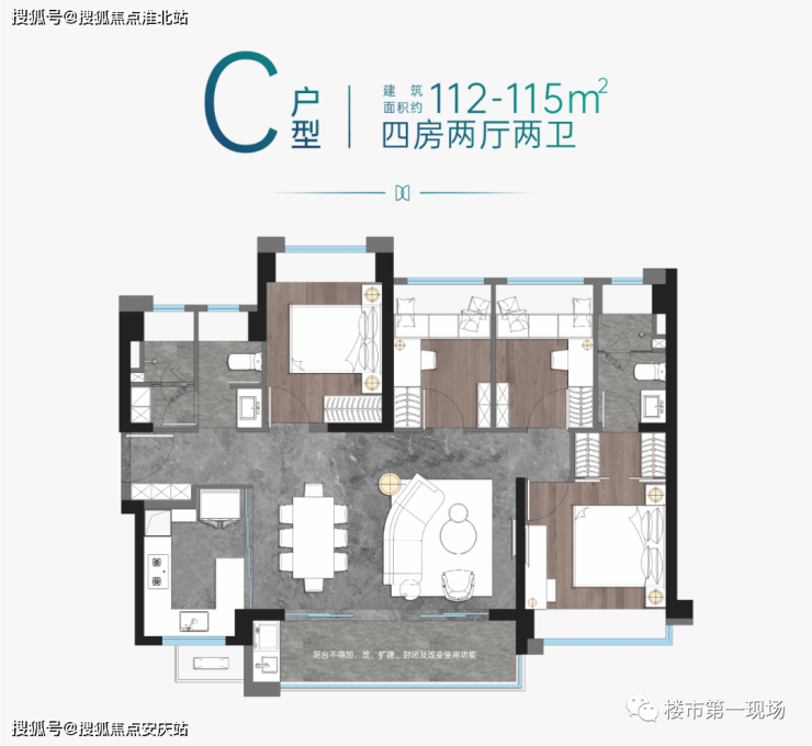 三胎换房客户,建议入手建面约112-115㎡四房两卫户型。灵动开阔的横厅设计,客厅有更多空间给孩子玩耍,采光通风俱佳。打造一体化中西厨,体验更好的家庭交流。