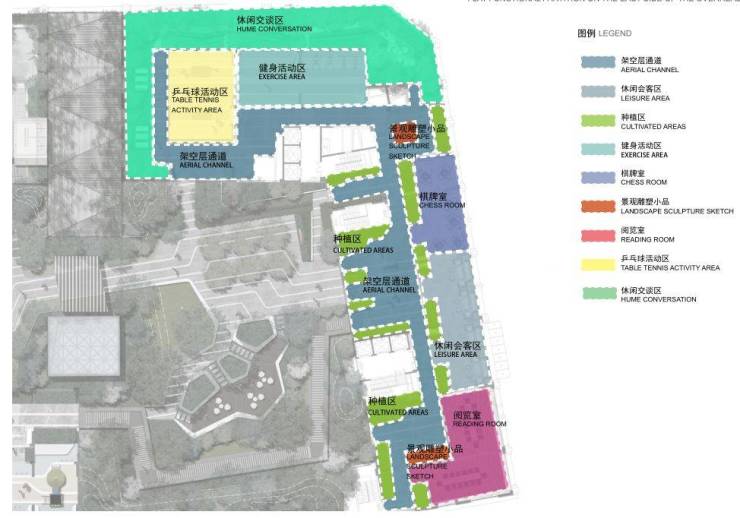 中通永安大厦架空层花园设置了棋牌区、休闲交流区、阅读区等功能区,满足老年群体休闲需求,不远处的健身区及空地也可供老年人练太极、舒展筋骨。