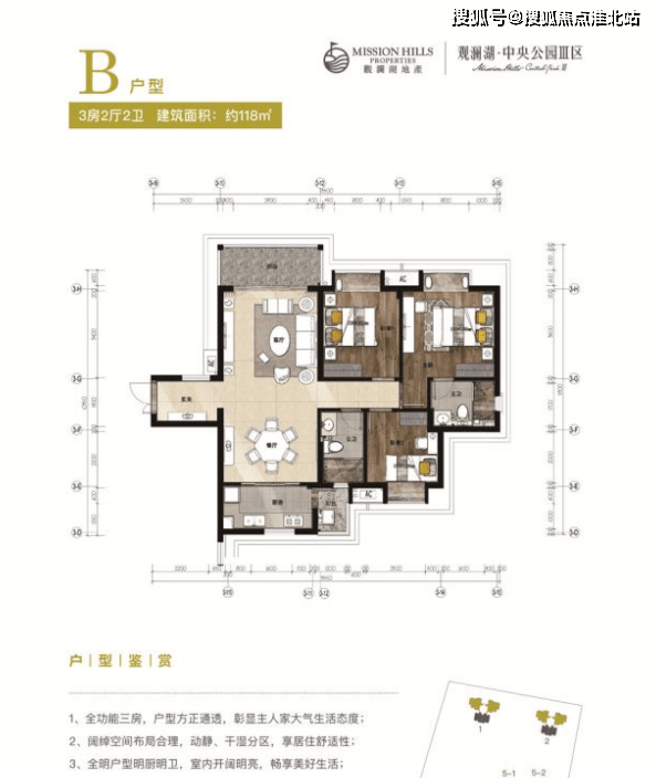 户型种类:主要有 63㎡的两房两厅一卫和 118㎡的三房两厅两卫两种户型。