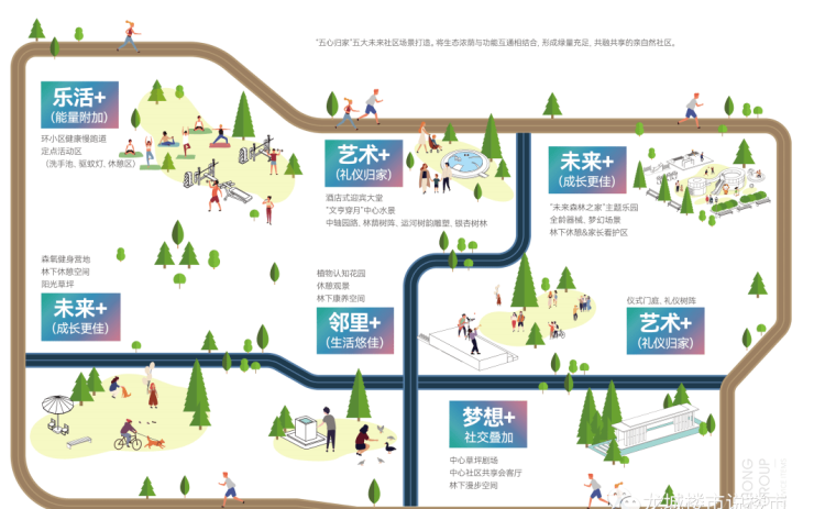 乐活+(能量附加):以580米健身跑道活力环+登高面活动场地打造亲子互动及健身运动空间。驱蚊灯、固化式坐凳等人性化设置,便于业主休整充能。