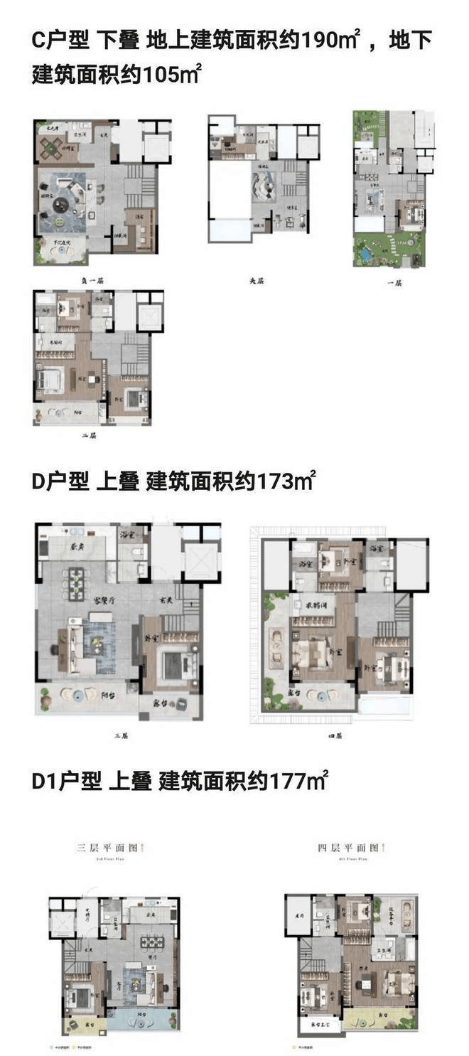 叠墅:4层,建面173-295㎡,分层设计,地下室层高5.3米
