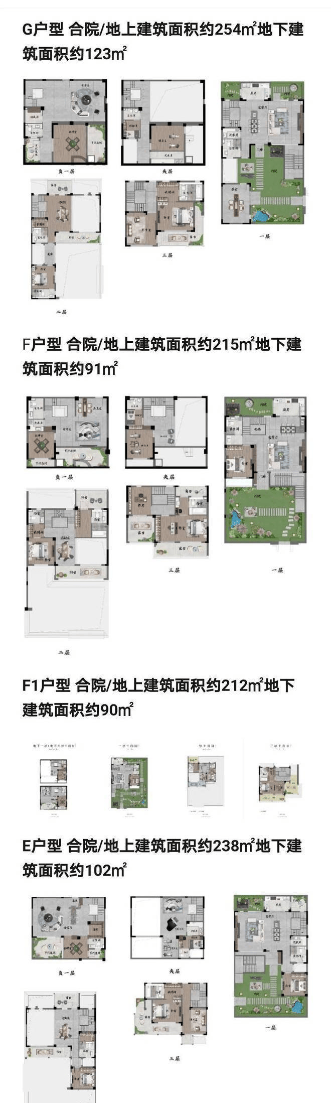 合院:3层,建面306-377㎡,带庭院及地下室,强调私密性