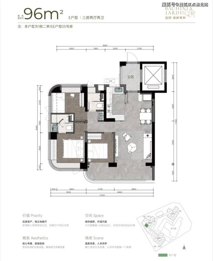 96m²E户型三房两厅两卫: