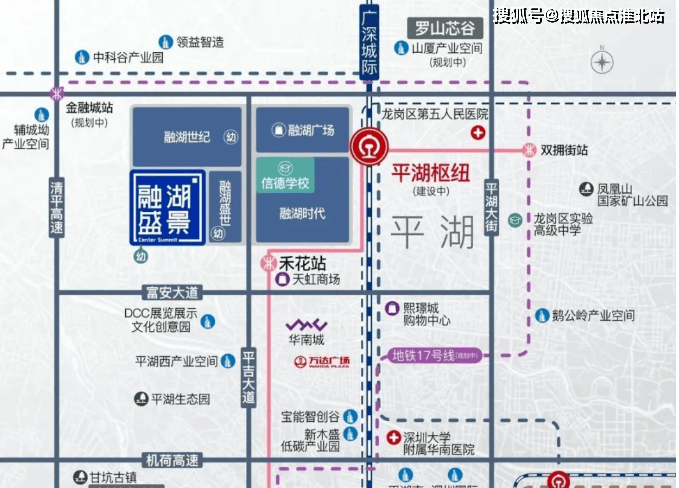 交通配套:项目紧邻平湖枢纽和白泥坑枢纽,距离 10 号线禾花站约 500 米,可快速到达坂田、福田中心区;此外,广深城际已开通,深惠城际、深大城际正在建设中;还有清平高速、丹平快速、机荷高速、水官高速等,可迅捷通达深圳各核心区。