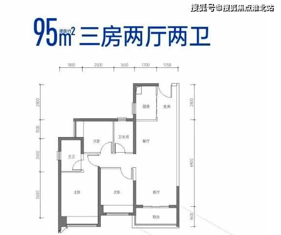 建面约 94㎡三房两厅两卫:该户型在 82㎡户型的基础上,增加了一个卫生间,主卧套房设计,带有独立的卫生间和衣帽间,提高了居住的私密性和舒适度。