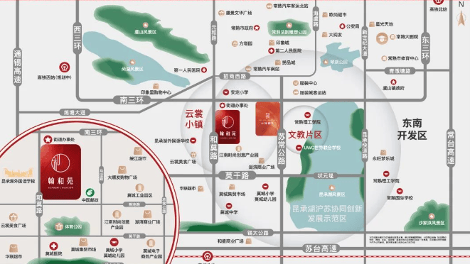 交通配套:出门即常熟南北向主干道和莫路以及三环高架,15 分钟可到达常熟各个地方,家门口有 524 国道,20 分钟可到达相城,35 分钟可到达苏州金鸡湖,项目西侧为常熟高铁西站,可实现江浙沪一小时经济圈9。