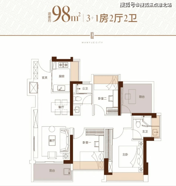 设计亮点:户型设计方正,有独立的玄关设计,提升房型结构及隐私性能。过道面积紧凑,空间利用率高。餐厅和客厅无缝连接,营造局部大空间的体验。主卧套房设计,配有独立的主卧卫生间,增加私密性。主阳台朝南,采光较好,且南北通透,厨卫全明,室内采光无死角。