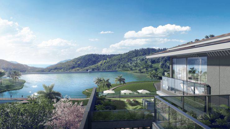 建筑与园林设计:由上海大器景观和澳大利亚 DAHD 设计公司联合打造,建筑依约 60 米自然地势高差精妙排布,确保每栋别墅或傍山、或观湖、或瞰海。建筑部分立面采用高档的蓝眼睛天然石料配以大面积玻璃,融入海南本土特有的火山岩及仿木纹铝板等精致装饰,窗材选用意大利阿鲁克系统门窗。