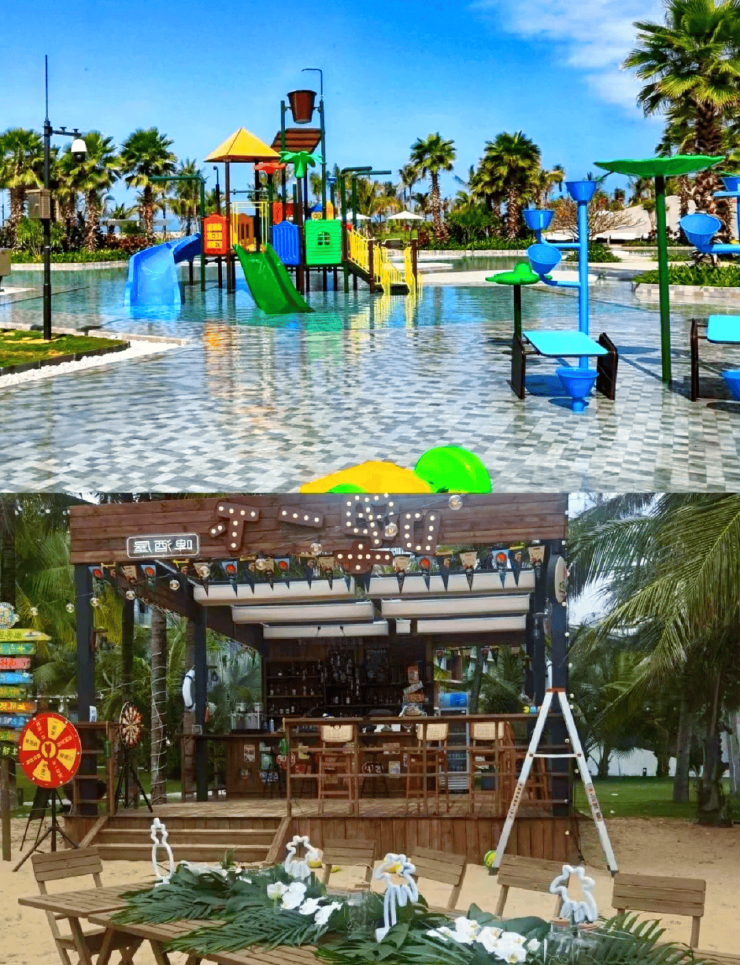 社区规划(组团 + 大盘共享):无边际海景泳池、滨海步道、儿童游乐区、健身中心、5500㎡文体中心(含海边美术馆、综合运动馆)、1.7 万㎡滨海商业街、游艇码头、万豪酒店集群;园林以热带滨海风情为主,多层次绿植搭配观海平台;