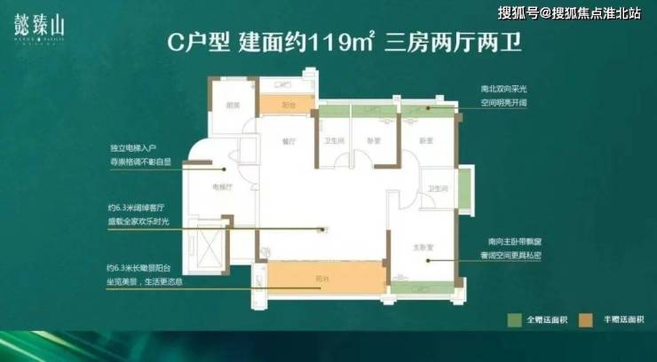 户户南北朝向,瞰山揽园约 119 ㎡王牌户型,层高 3.2 米