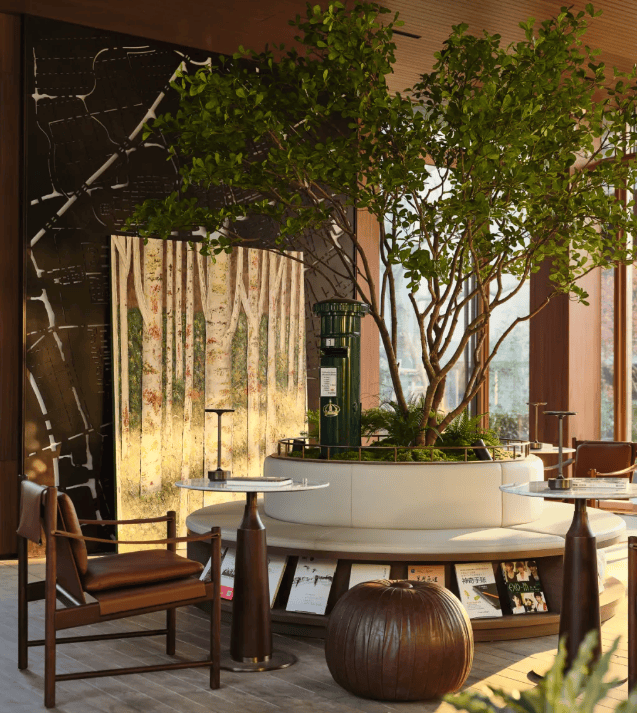 项目位于小镇核心发展主轴之上,绿色围合环抱,无建筑遮挡,视野极佳,水系环绕。