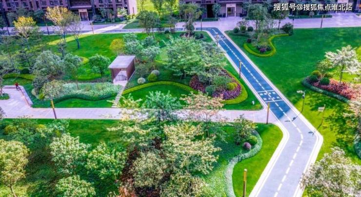 从空中俯瞰,不同楼栋间设置了不同的景观,阳光大草坪与树木交错排列,一切都井然有序。