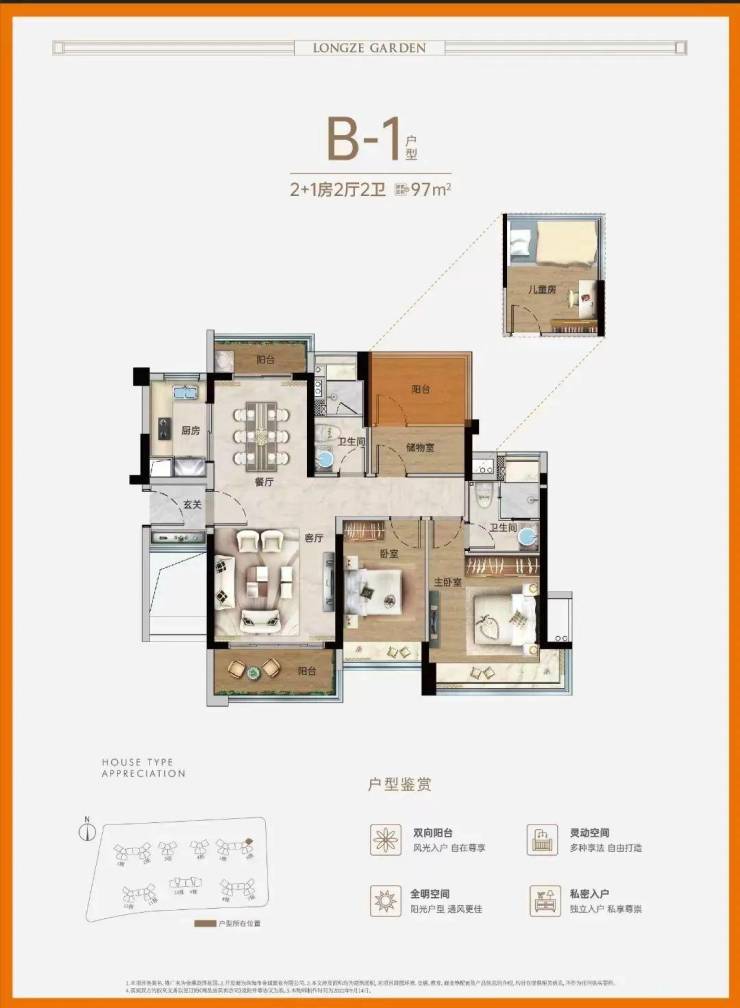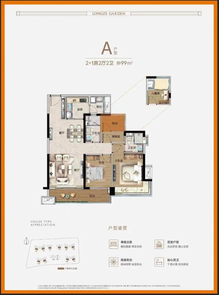 建面约99㎡2+1房,分布在每一栋(除了9/10栋)的南侧,景观方面也随着不同楼栋的位置有所不同。