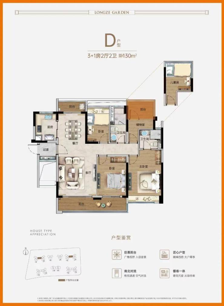 建面约130㎡3+1房,独立的玄关保证了私密性;南北对流双阳台,主阳台连通客厅、次卧。