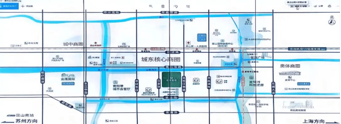 周边配套:步行可达昆山商厦邻里广场,3 公里范围内覆盖首创奥特莱斯、昆城广场、世茂广场等商业中心。直线距离约 500 米有景王路一贯制学校,周边还有苏大附中、震川高级中学等。昆山市第一人民医院东部医疗中心距离项目约 1.3 公里。