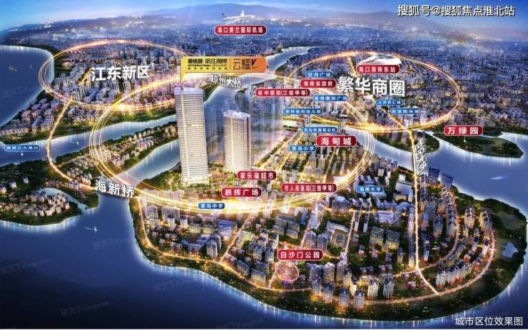 约72万方城熟滨水综合体,涵盖星级酒店、双子塔、环形中心商业、沿江风情商业,是海口市的三江交汇处的滨水综合体项目。项目位于海甸岛的东南角,与骑楼老街隔江相望,世纪大桥、和平桥、人民桥、海新桥横跨海甸溪接连滨海大道,距离海口动车站直线约10公里,通往机场约30